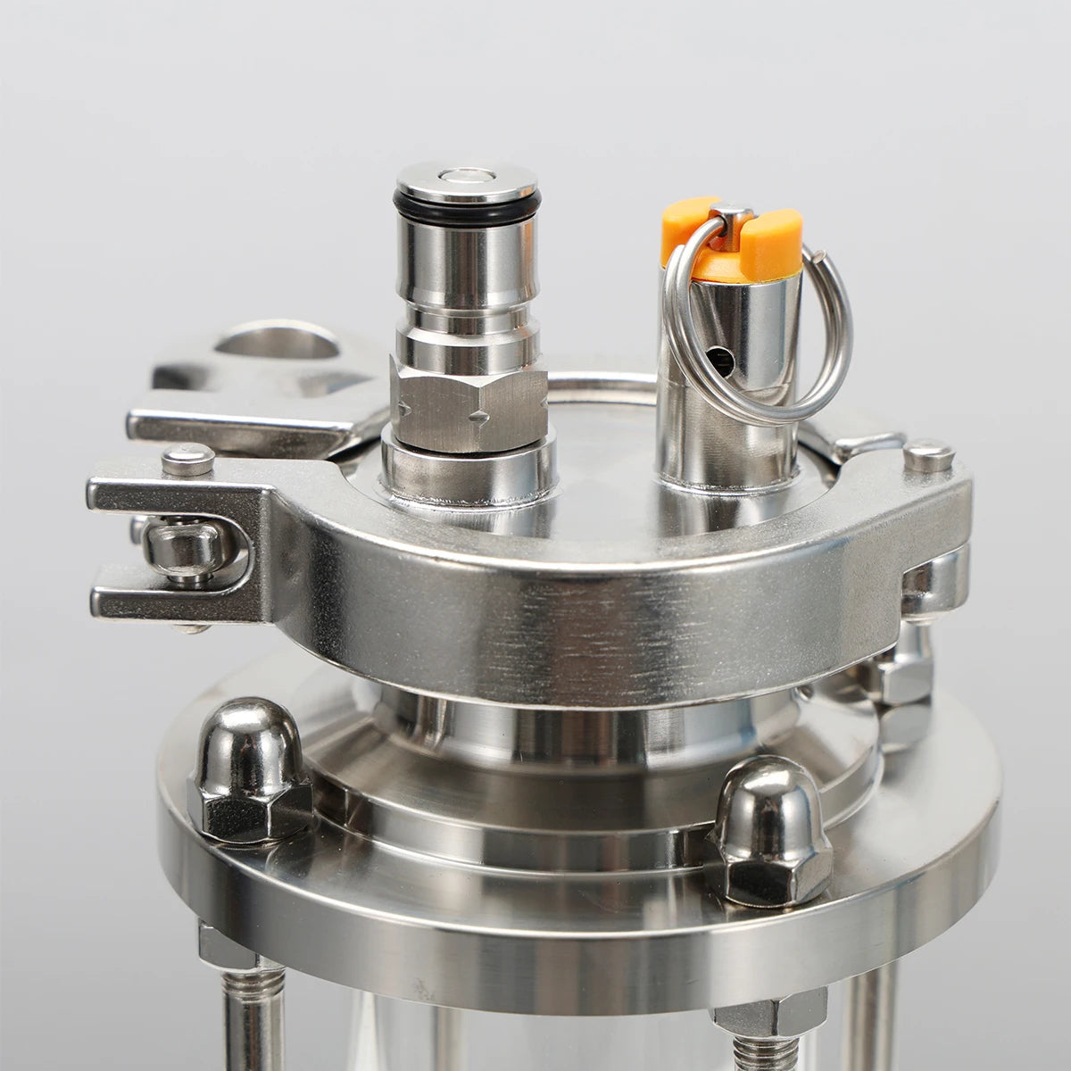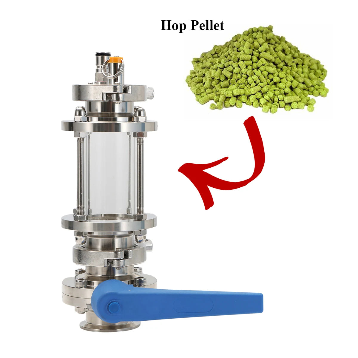 Connect this dry hopper to your fermenter and fill the sight glass with hops. Install the dry hopper lid and purging out the oxygen by filling with co2. By equalizing the pressure inside the sight glass and fermenter, you can add anything to your beer without degassing or depressurizing.