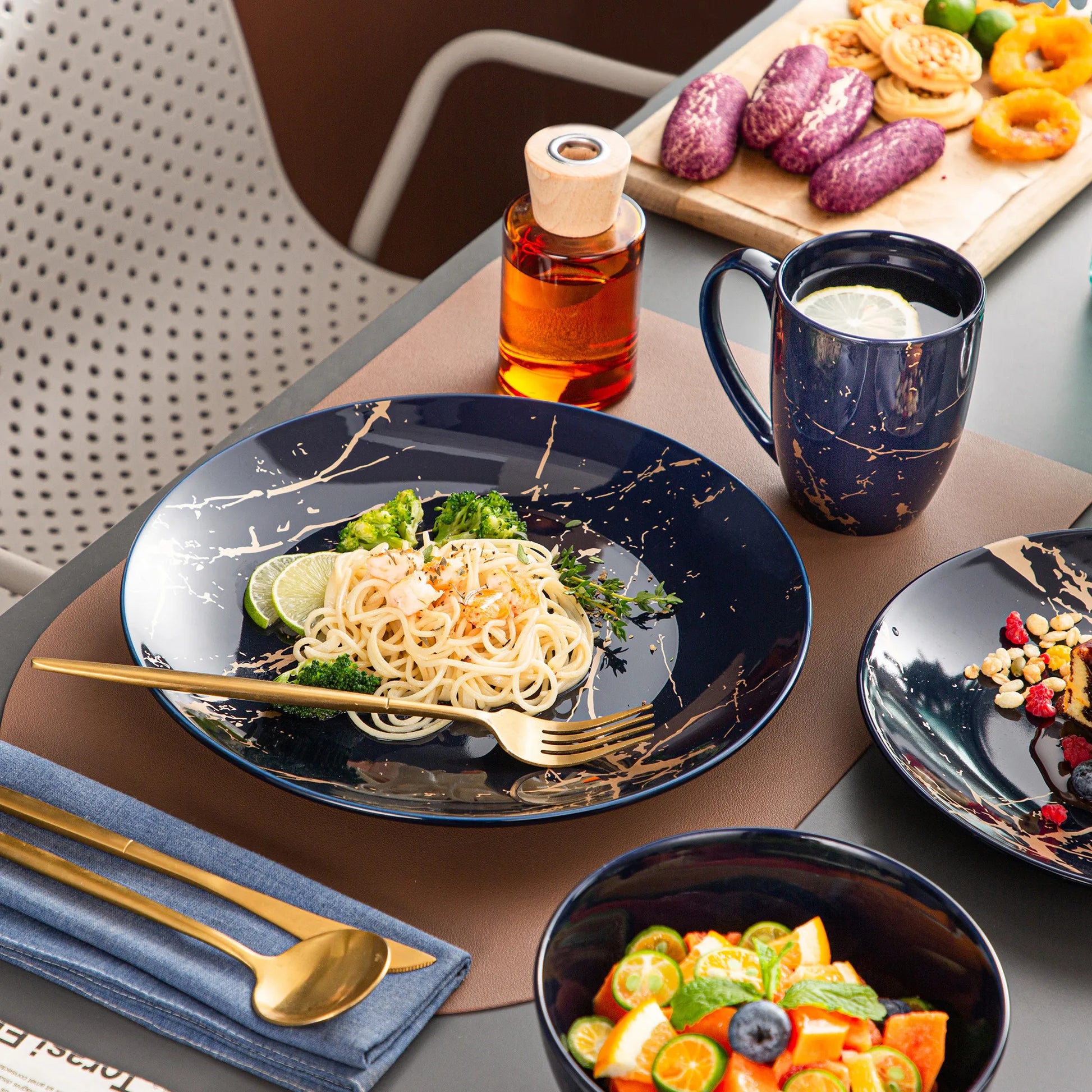 LOVECASA Dark Blue 16/32/48 Piece Procelain Tableware Set Design By Gold Splash with Dinner Plate,Cake plate,Bowls,Coffee Cups