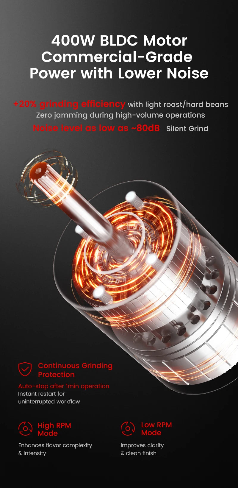 +20% grinding efficiency with light roast/hard beans Zero jamming during high-volume operations