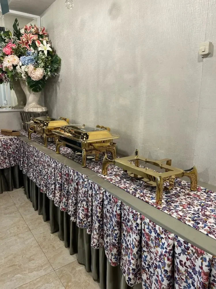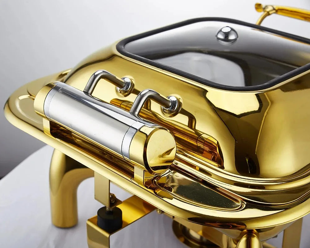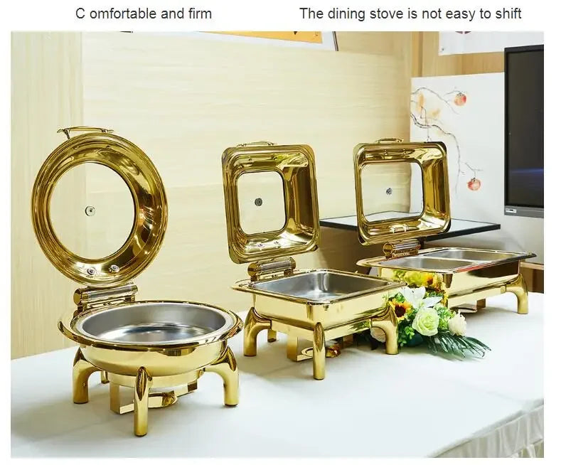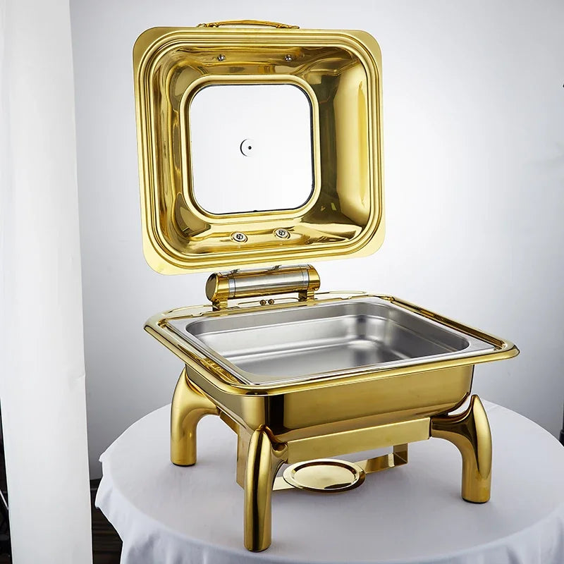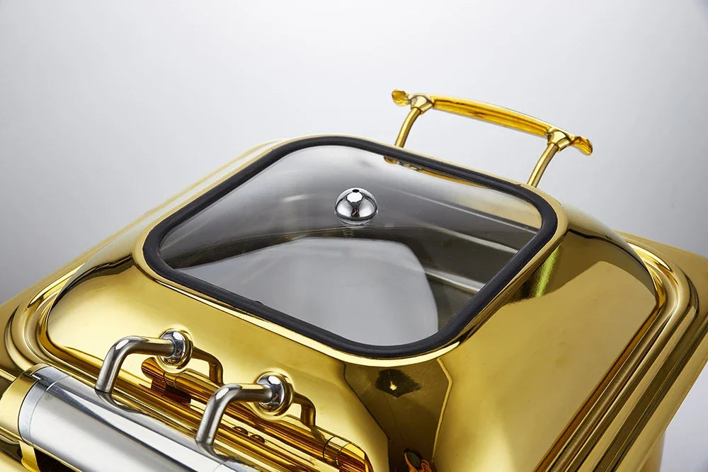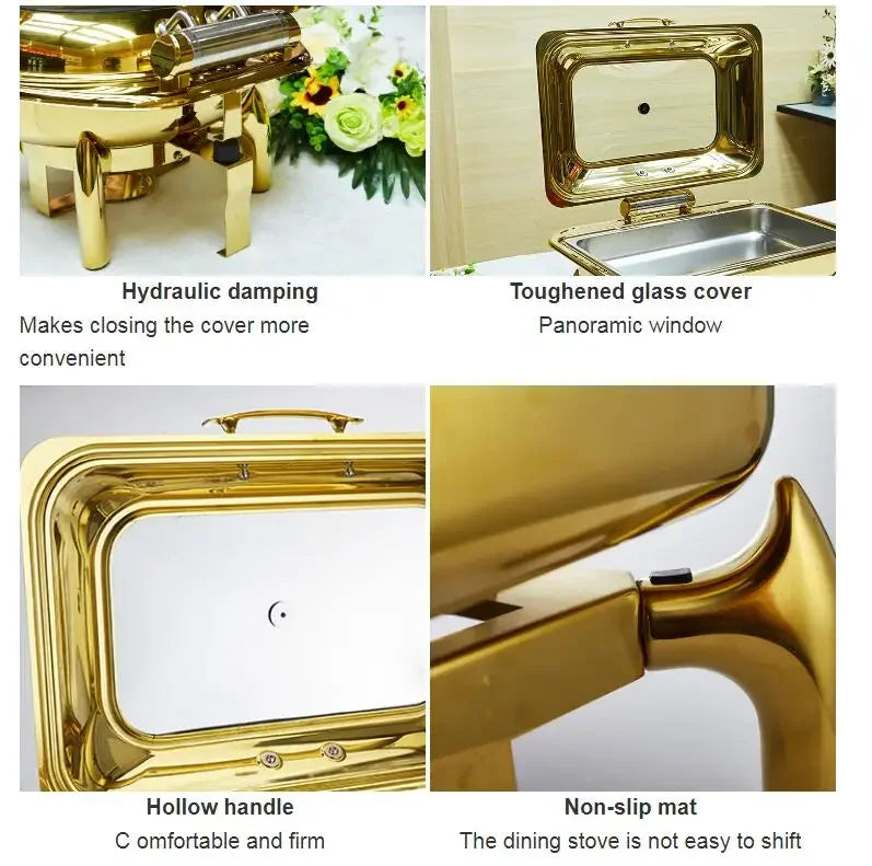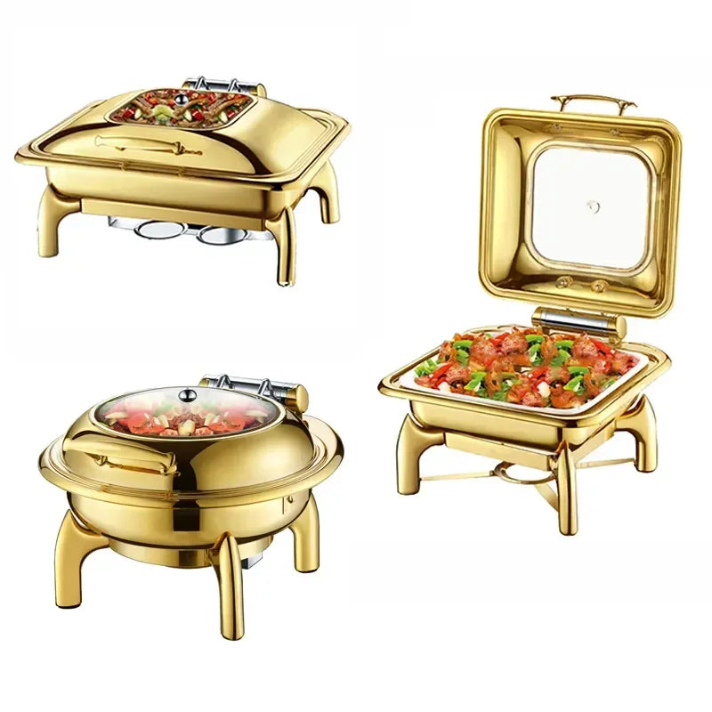 Nice round glass lid window hydraulic soft closing gold colour buffet chafers set hold accent food warmers buffet chafing dish