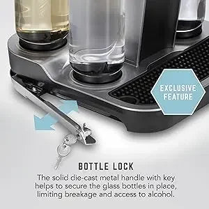 Bottle Lock Limits Alcohol AccessThe solid die-cast metal handle with key helps to secure the glass bottles in place, limiting breakage and access to alcohol. |