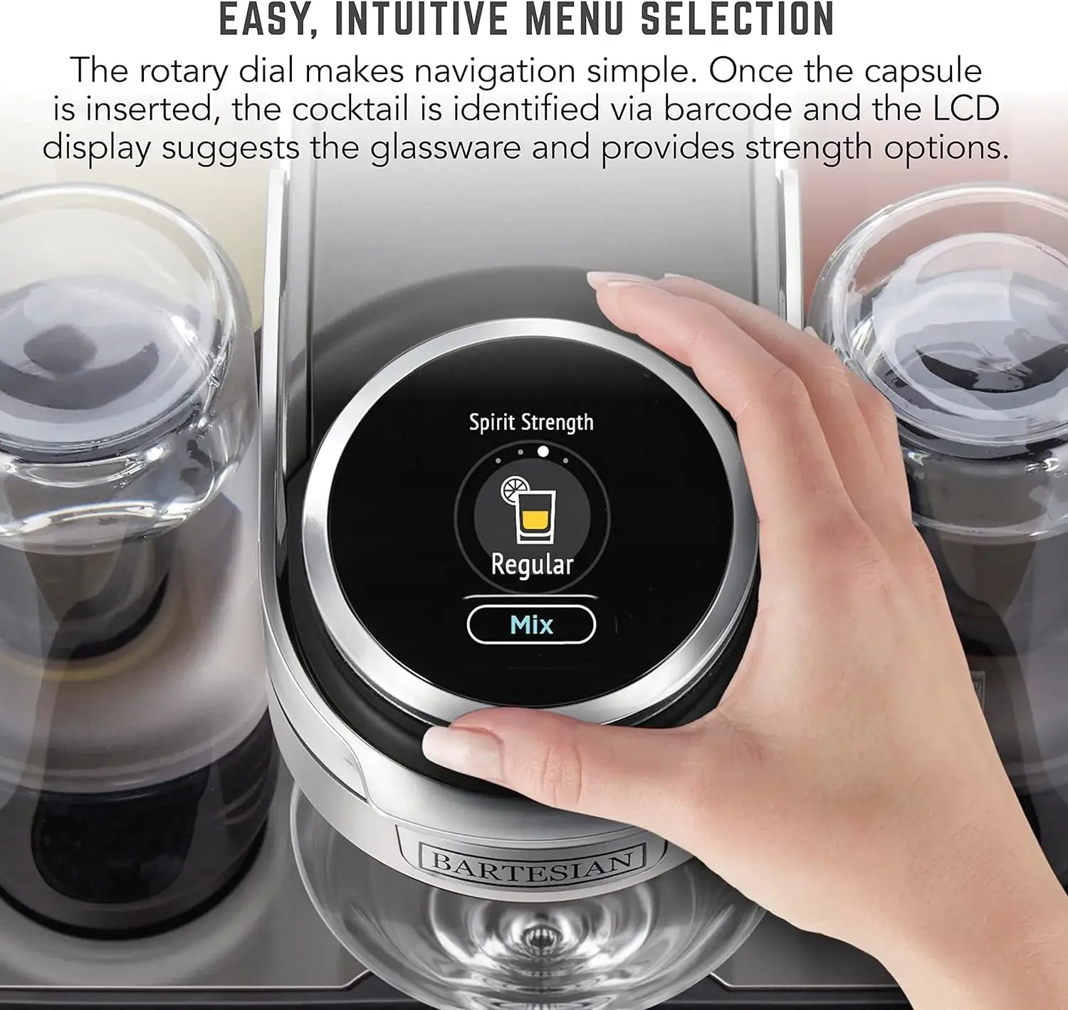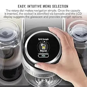 The intuitive rotary dial makes navigation simple. Once the capsule is inserted, the cocktail is immediately identified via barcode and the user-friendly LCD display suggests the proper glassware and provides strength options.
